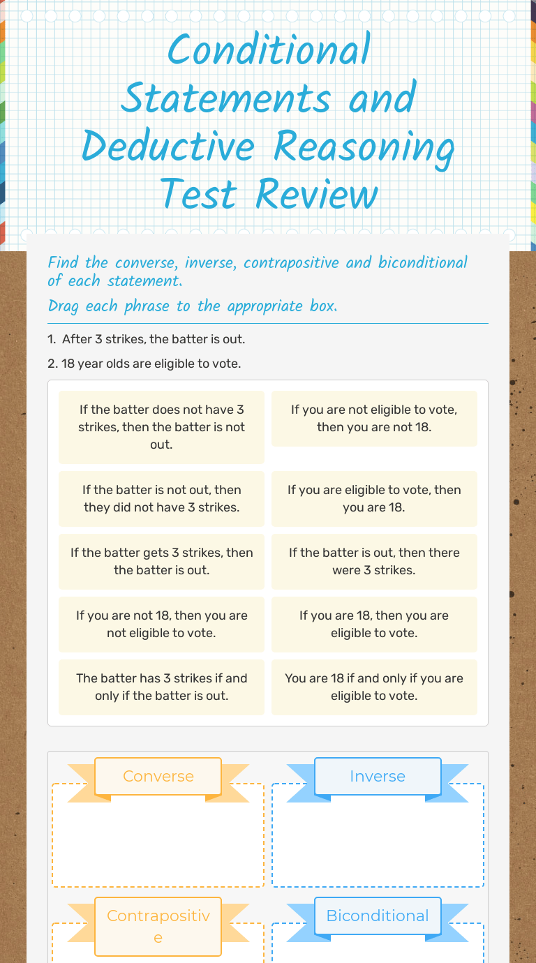 ➢ write a conditional statement on the board and under it, write the converse, inverse, and contrapositive statement inverse converse contrapositive worksheet. (it is on page 2).
